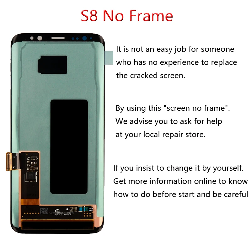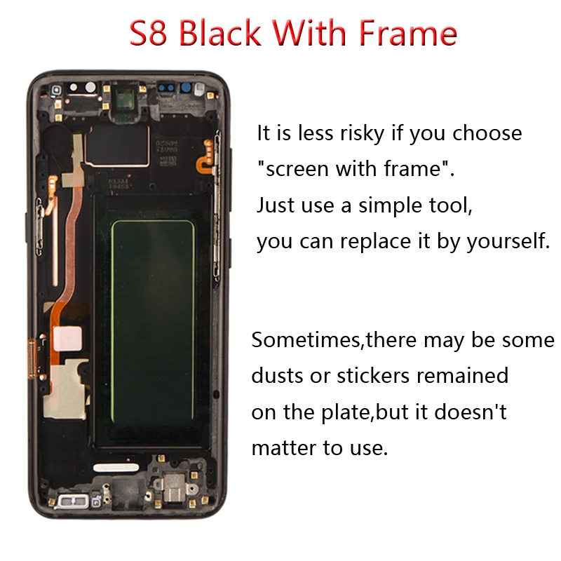 1. Please note that this screen has burn shadows. You must understand that if you have strict requirements on the quality of the screen, please purchase a screen without burn shadows. There are also such screens in my store. You can find it.It’s more expensive than this one. 2. Before buying, please confirm your phone model (S8 Or S8 Plus), if you are not sure of the phone model, please contact us, please do not choose the wrong model. S8: 5.8 Inch S8Plus: 6.2 Inch 3. Please note that the color of the silver frame is very close to that of the gold frame. Buyers often think that we sent the wrong color, but this is a misunderstanding. Please don’t think that we will send the wrong color, it is impossible, we will check the order and the goods several times before shipping.