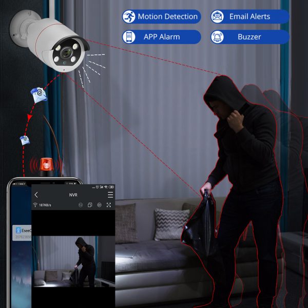 1.AI function,when motion detection,the camera will alarm,two LED lights will light up and email alert.